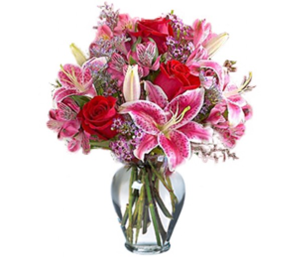 A gorgeous combination of Red Roses and Pink Stargazer Lilies rounded out with complimentary flowers in white and pink. Flowers that are a sure symbol of love and affection. Order flowers online now or call Terra Flora Flowers Denver at 720 300 8894 directly to place your order today with a local Denver florist. Flower Delivery in Denver CO Available.